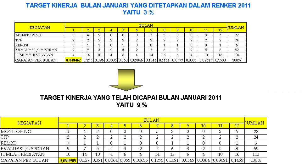 Berdasarkan Rencana Kerja dan Program Kerja yang telah ditetapkan bahwa kinerja bulan Januari 2011 capaian Tugas Pokok dan Fungsi Divisi Pemasyarakatan ditetapkan 3,8 % namun pada kenyataan telah melewati target yaitu 9,0 %.