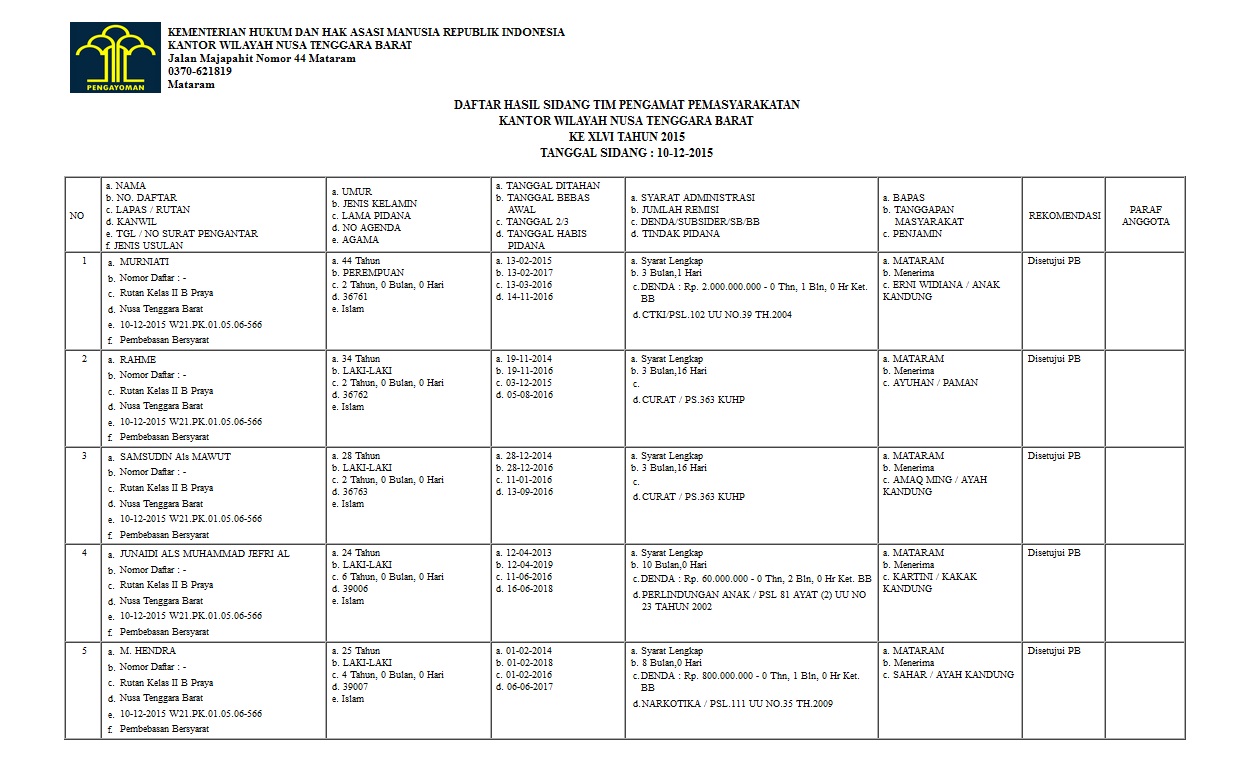 HASIL SIDANG TIM PENGAMAT PEMASYARAKATAN (TPP) KANWIL