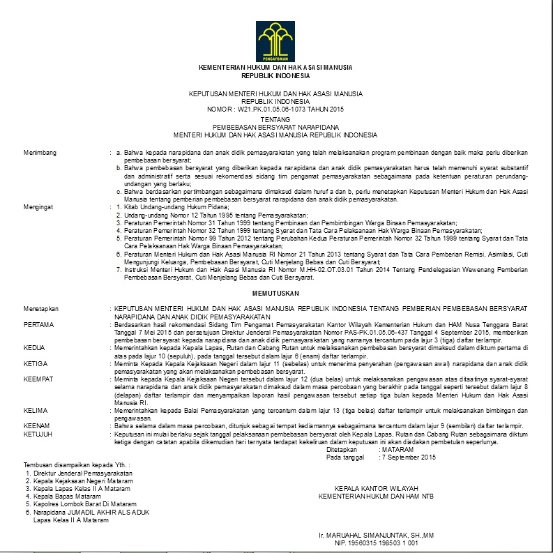Contoh SK PB Online yang telah dicetak di Kantor Wilayah :