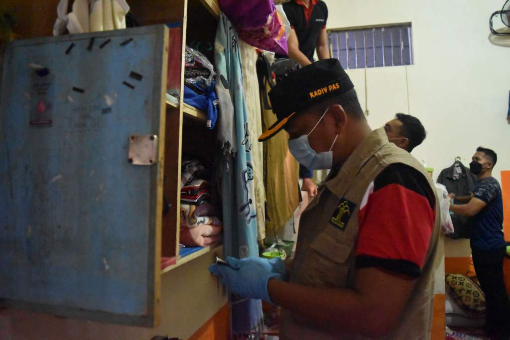 Maliki, selaku Kadivpas NTB juga tidak segan-segan bergabung bersama timnya untuk turut serta menggeledah kamar-kamar hunian yang terindikasi memiliki barang terlarang.