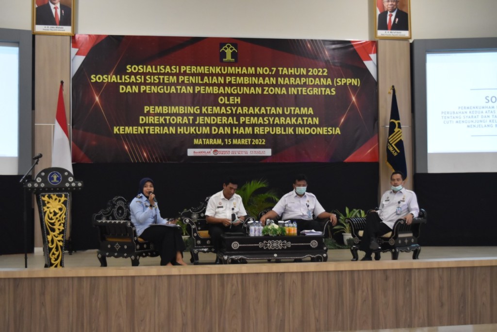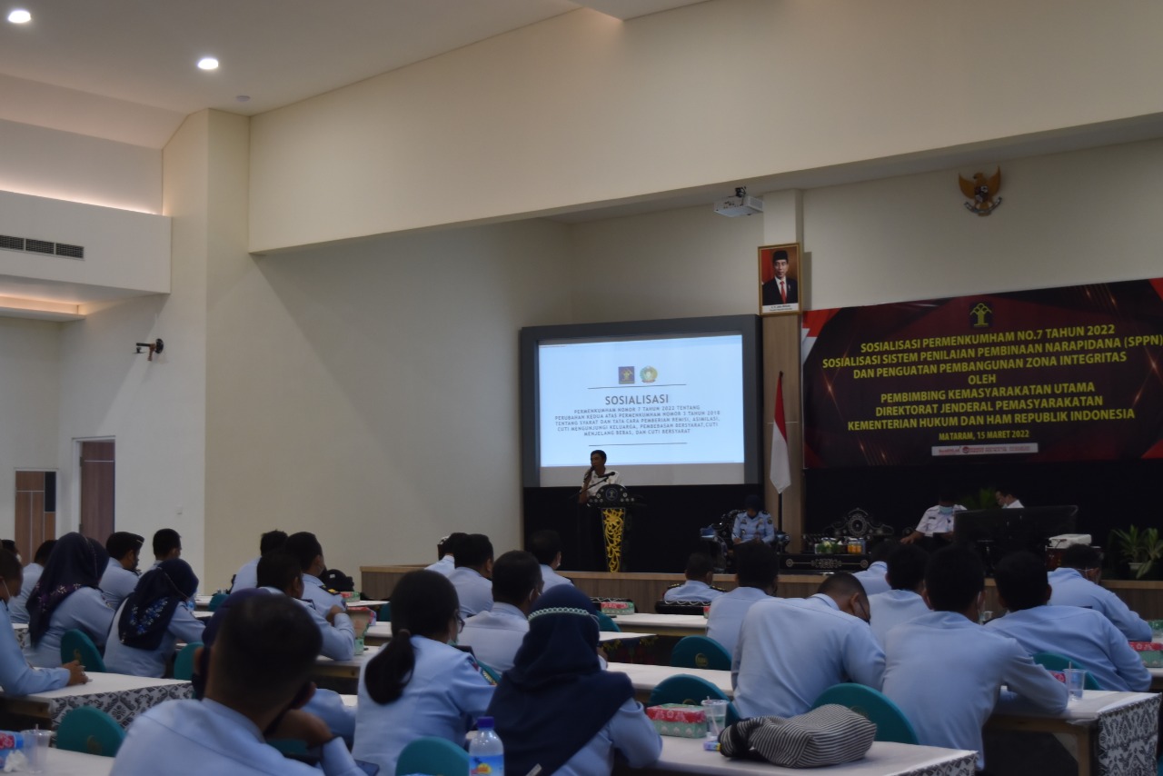 Mataram – Dengan disahkannya Peraturan Menteri Kementerian Hukum dan HAM (Permenkumham) Nomor 7 tahun 2022 oleh Menkumham RI Yasonna H. Laoly, Kanwil Kemenkumham NTB gelar sosialisasi tentang Syarat dan Tata Pelaksanaan Remisi, Asimilasi, Cuti Mengunjungi Keluarga, Cuti Menjelang Bebas, Cuti Bersyarat, dan Pembebasan Bersyarat serta Sistem Penilaian Pembinaan Narapidana (SPPN) pada Selasa, 15/03/2022.