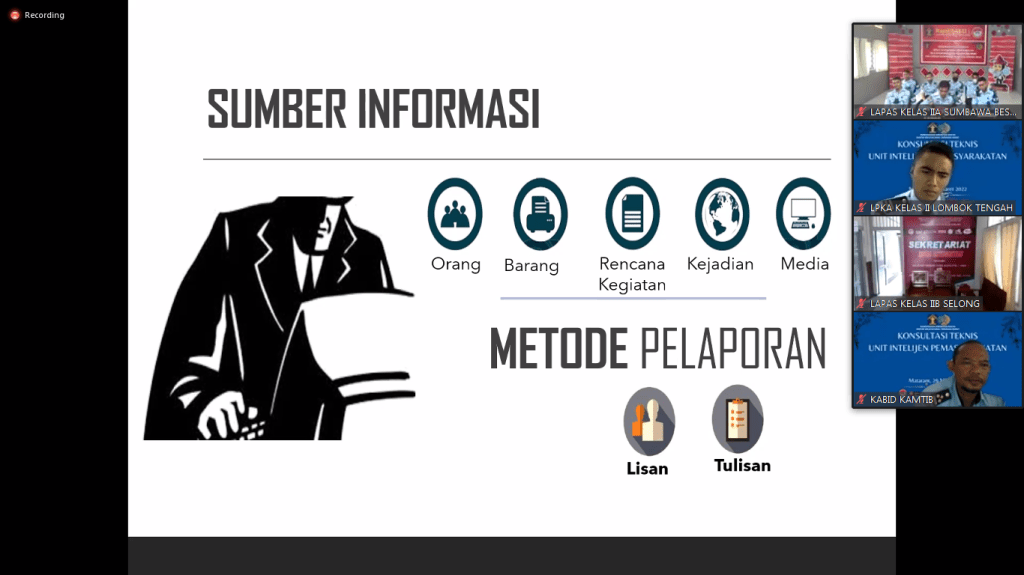 Mataram – Divisi Pemasyarakatan NTB laksanakan Konsultasi Teknis terkait SDP Fitur Keamanan dan Konsultasi Teknis Terkait Unit Intelijen Pemasyarakatan secara daring pada Selasa, 29/03/2022. Kegiatan dibuka oleh Kepala Bidang Keamanan, Amam Saifulhaq, diikuti oleh perwakilan peserta dari Unit Pelaksana Teknis se-Nusa Tenggara Barat. Tak hanya itu, hadir pula perwakilan dari Direktorat Jendral Pemasyarakatan Subkoordinator Intelijen Wilayah II, Eksa Rahnuzulian, dan Pengolah Data Laporan Keamanan dan Ketertiban, Bogi Nurseto, sebagai narasumber.
